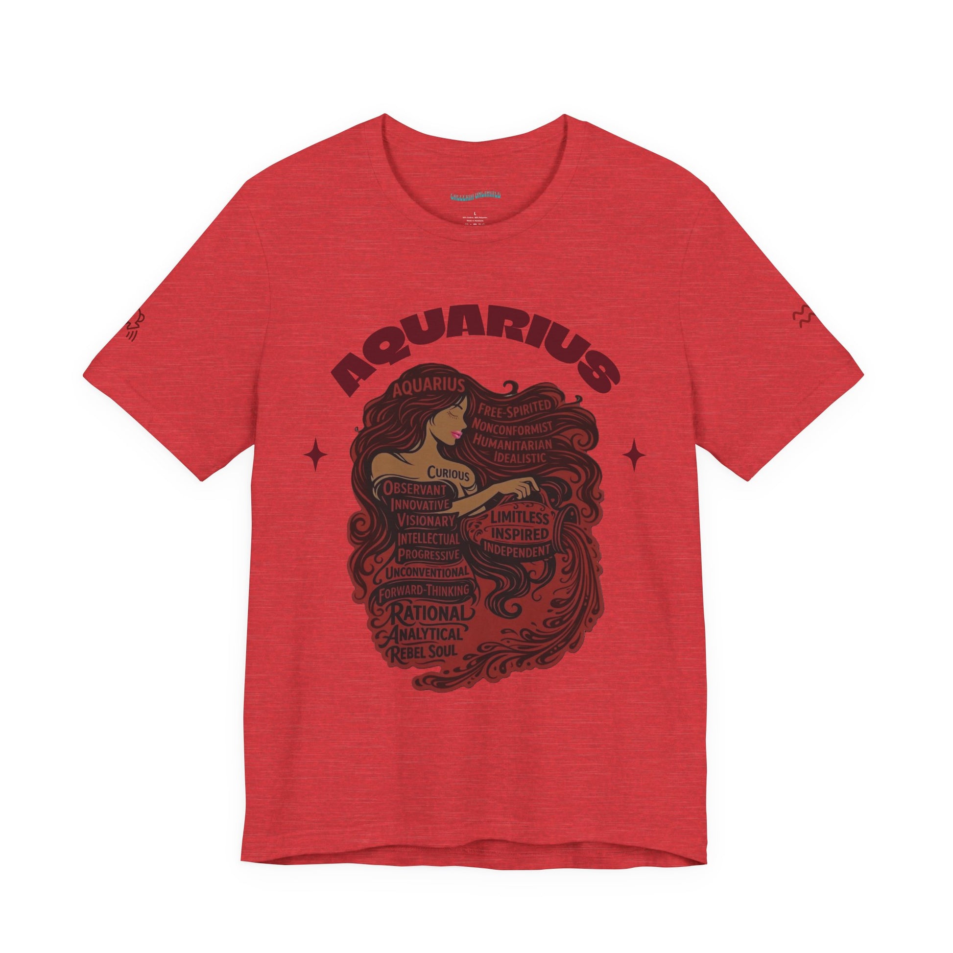This Aquarius T-Shirt brings the grounded strength of Aquarius to life in rich shades of red and mauve—colors that symbolize determination, endurance, and quiet passion. The central illustration features a Aquarius muse formed entirely from defining traits, transforming words like free-spirited, analytical, and visionary into wearable art.