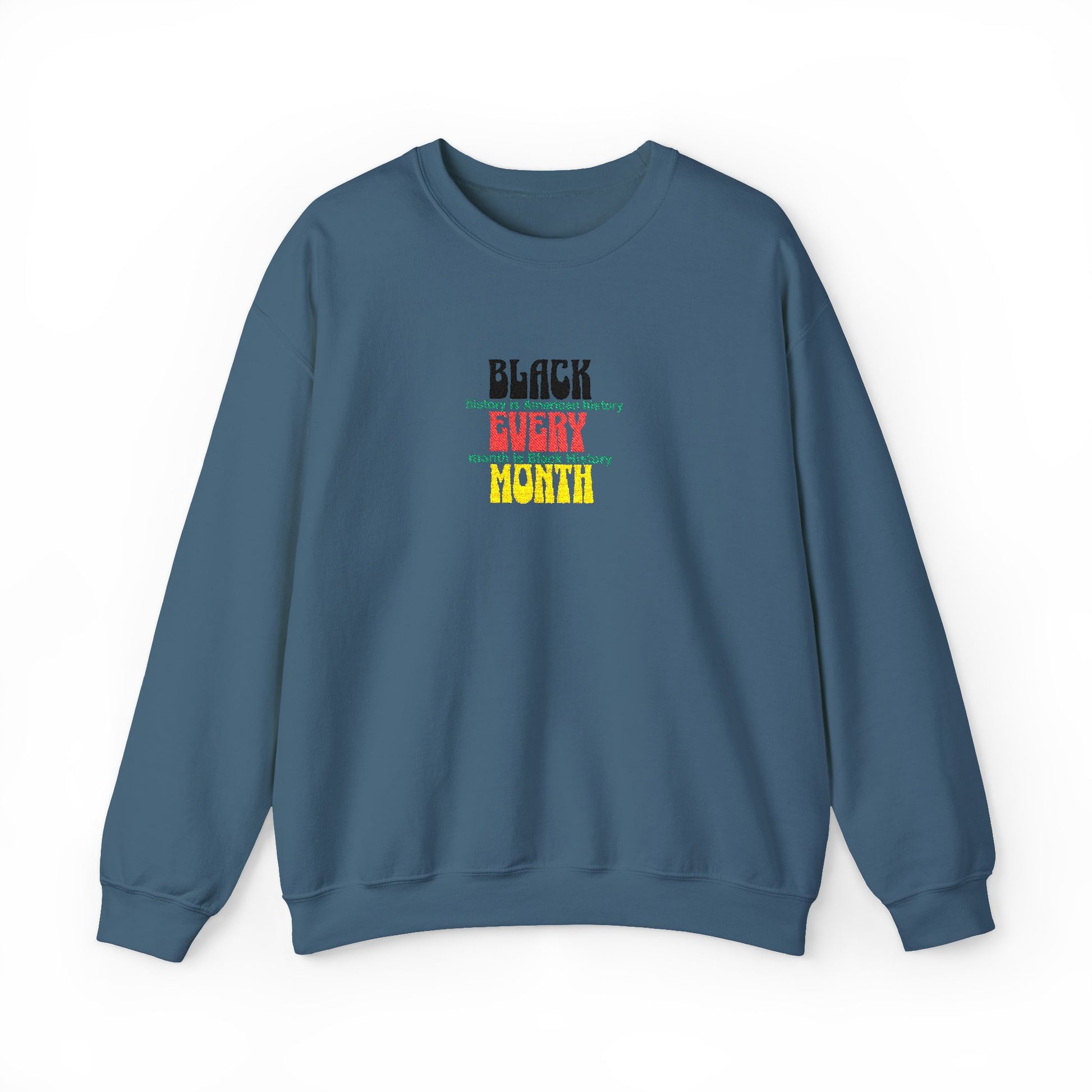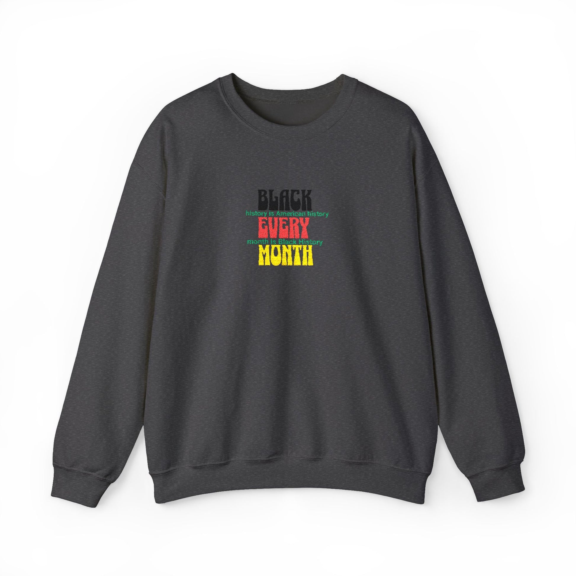 A soft, midweight crewneck sweatshirt embroidered with a Black Every Month colorful statement across the chest. The classic cut and ribbed collar sit easy over layers, while the tubular knit body and double-needle stitching make it durable enough for daily wear.