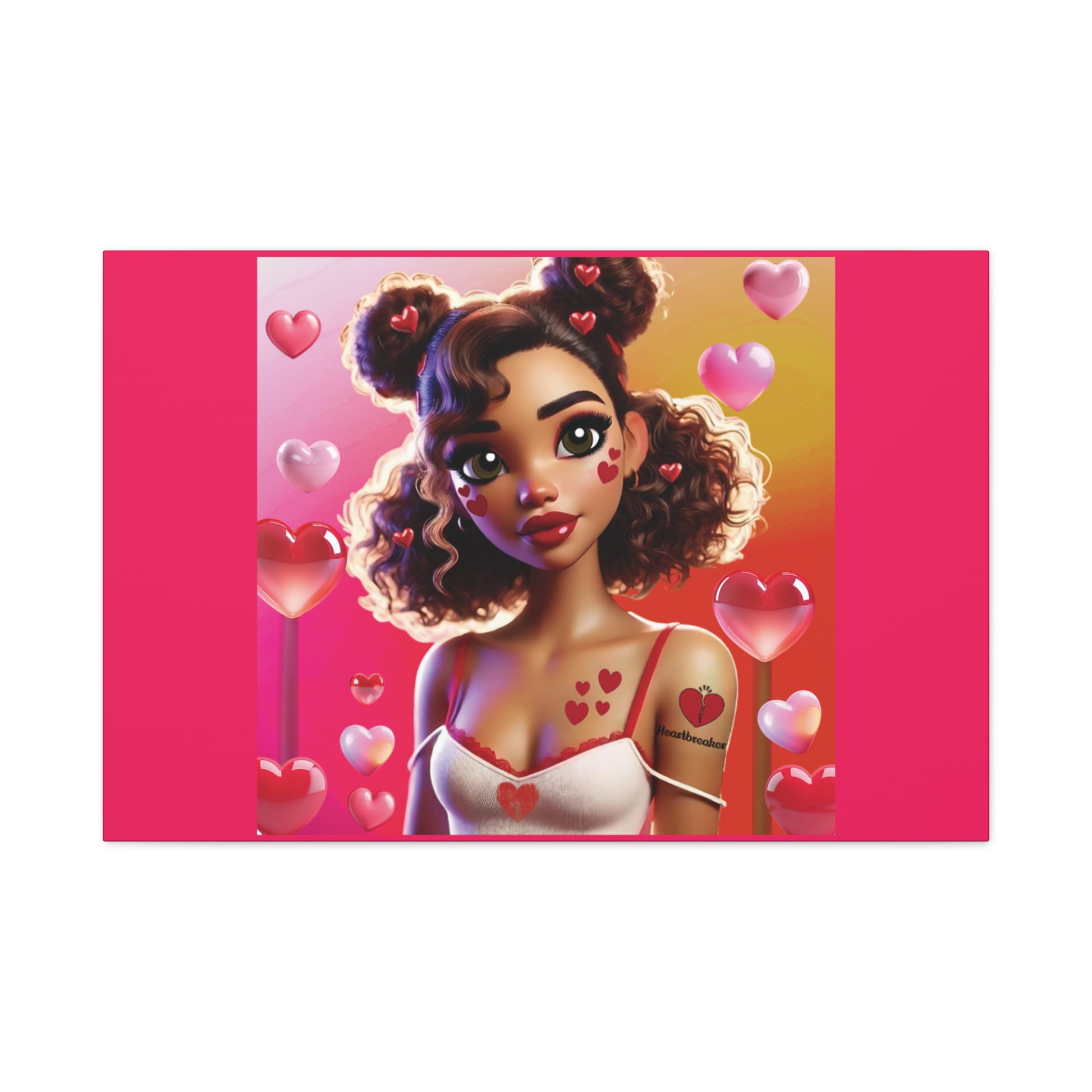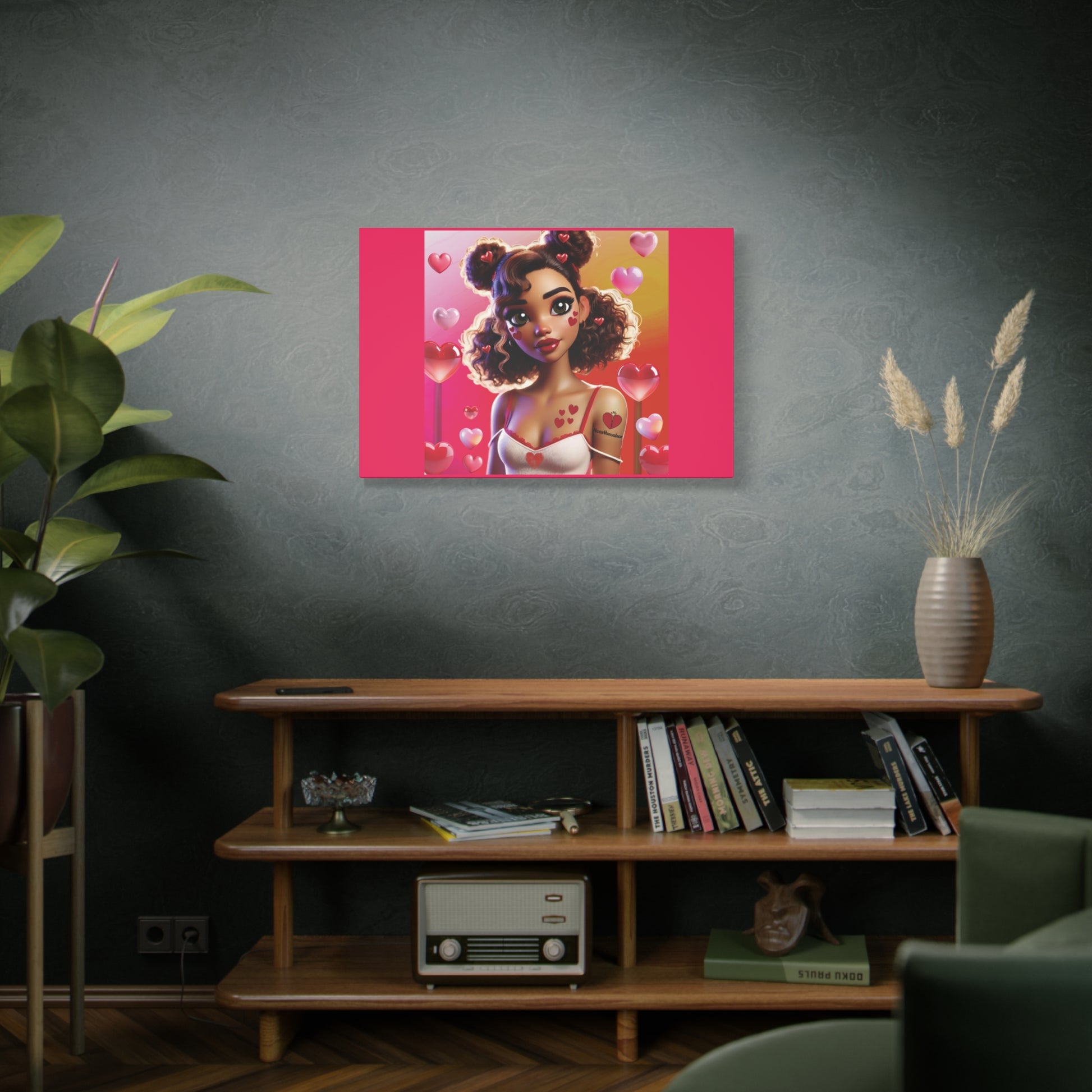 This stretched matte canvas brings playful romance and bold color to any room. The vibrant print shows a stylized portrait of a confident, contemporary heroine surrounded by floating hearts and warm, sunset tones. The smooth matte finish tames glare while preserving rich color depth from the Greenguard Gold-certified inks. Stretched over a renewable pine frame with soft rubber bottom dots and pre-installed hanging hardware, it arrives ready to hang — horizontal, vertical, or square options let you choose the best orientation for your space. It settles into living rooms, bedrooms, or studio walls where upbeat, modern art and cozy, intimate vibes meet.