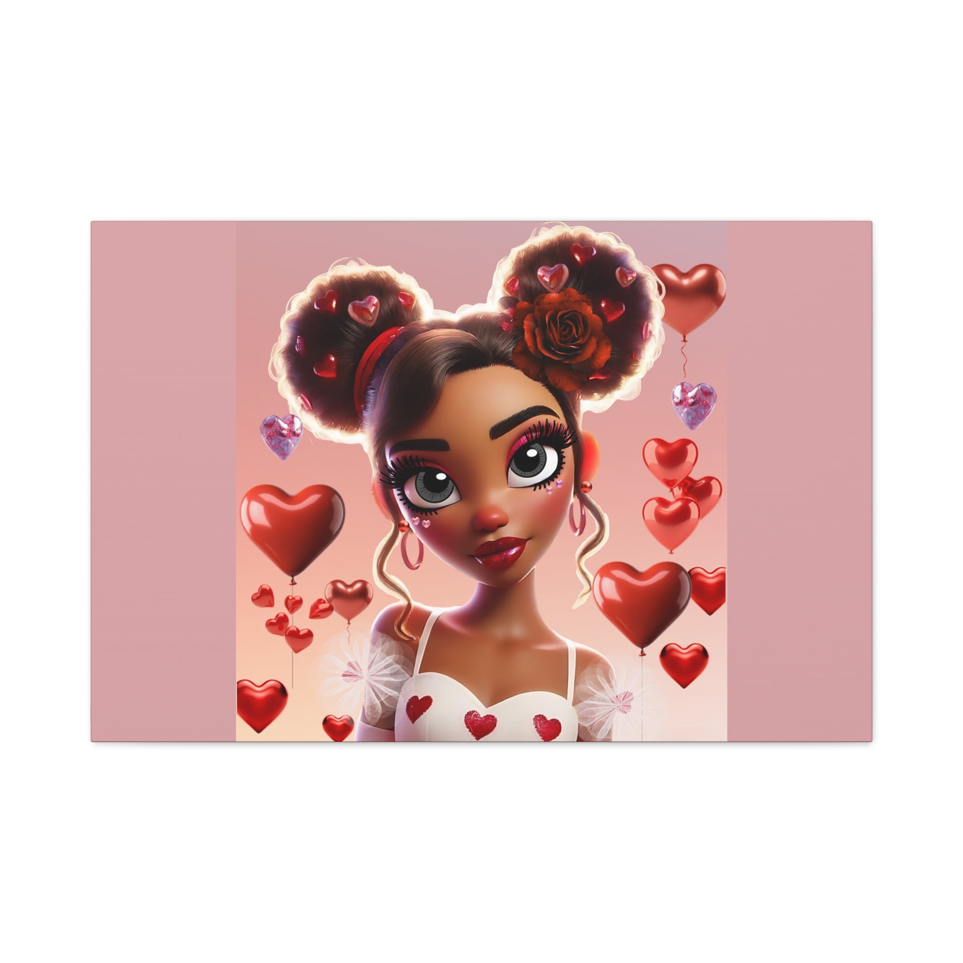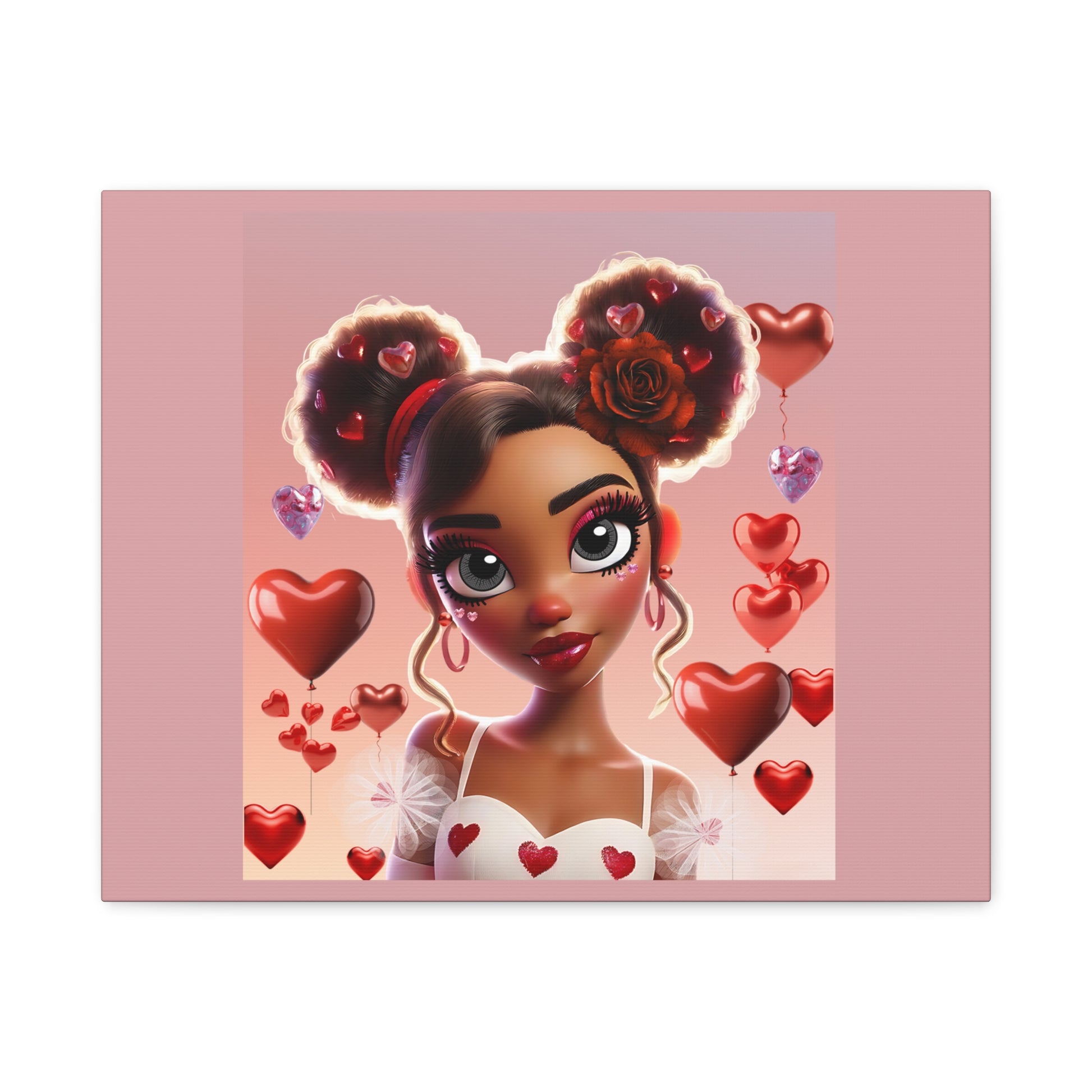 A soft, modern matte canvas print that brings playful romance into any room. The stretched canvas shows a stylized portrait of a young woman surrounded by floating hearts and warm pink tones. Subtle texture in the matte finish softens glare and adds depth to the illustration, while the wrapped 1.25" pine frame gives a clean, gallery-ready edge. Lightweight and ready to hang, this piece slips into bedrooms, cozy reading nooks, or creative studios to add a personal, heartfelt touch to the space.