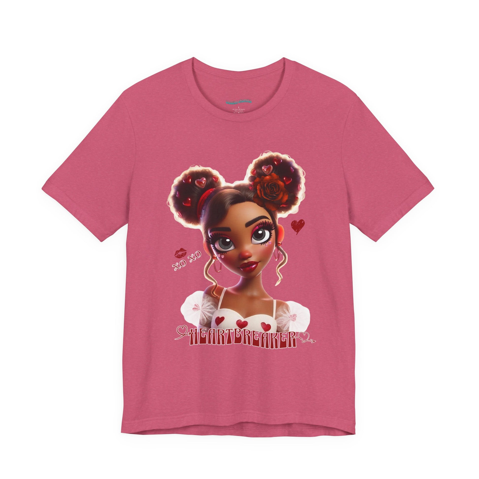Soft, wearable art for anyone who loves bold, playful self-expression. This lightweight jersey tee features a vibrant illustration of a young woman with double buns, heart motifs, and glossy highlights—colors that pop on the heathered fabric. It hangs casually from the shoulders and layers easily under jackets or over dresses. Wear it to show a flirty, confident vibe while running errands, meeting friends for coffee, or lounging at home. The breathable knit keeps you comfortable during warm days or active weekends, while the subtle vintage-heather texture gives the design a lived-in, loved look.