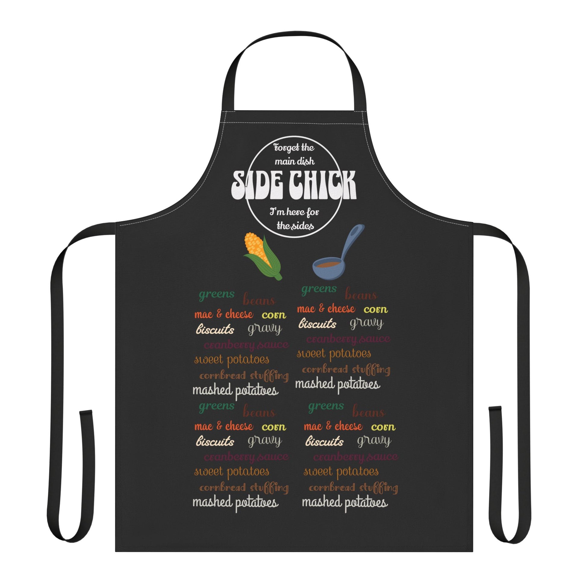 This apron brings warmth and humor to the kitchen with playful, food-themed graphics. Bold headline text reads “SIDE CHICK” with a cheeky subline, while illustrated corn and ladle icons and repeating menu-style words (mashed potatoes, gravy, biscuits, corn) create a cozy, down-home vibe. The durable polyester canvas has a soft foam lining for comfortable wear while you cook, bake, or host. Adjustable tie-back closure with a vibrant print that