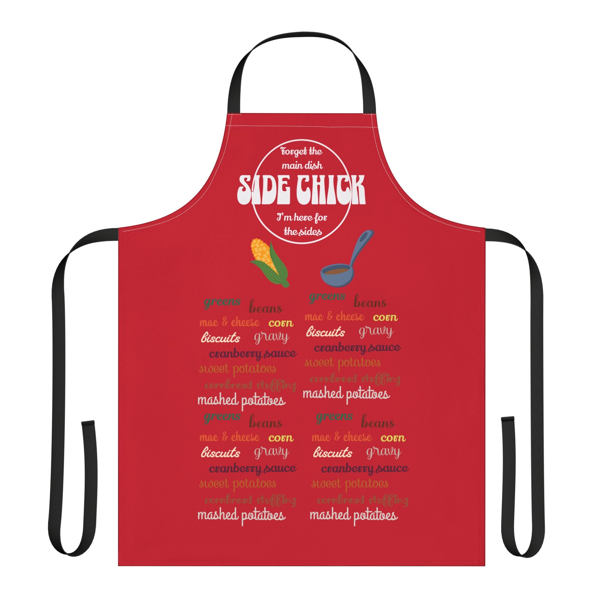 This apron brings warmth and humor to the kitchen with playful, food-themed graphics. Bold headline text reads “SIDE CHICK” with a cheeky subline, while illustrated corn and ladle icons and repeating menu-style words (mashed potatoes, gravy, biscuits, corn) create a cozy, down-home vibe. The durable polyester canvas has a soft foam lining for comfortable wear while you cook, bake, or host. Adjustable tie-back closure with a vibrant print that